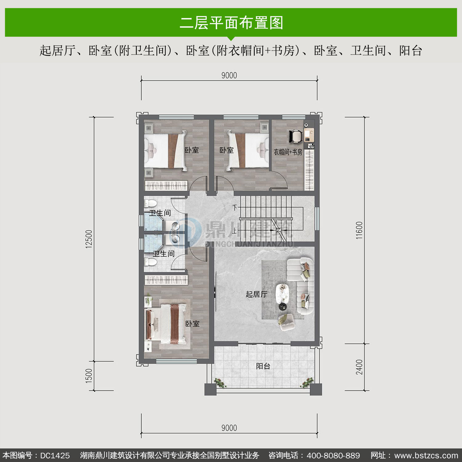 | 二 层: | 起居厅、卧室(附卫生间)、卧室(附衣帽间+书房)、卧室、卫生间、阳台 | |||
