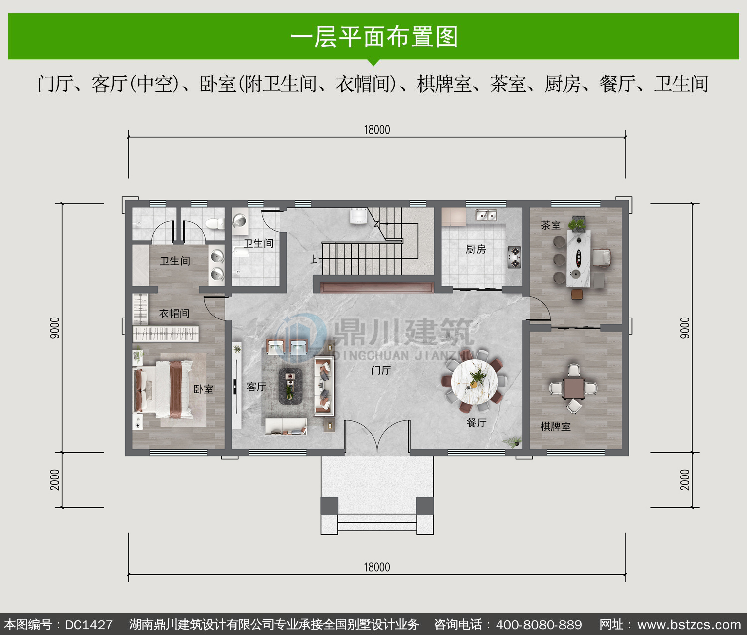 | 一 层: | 门厅、客厅(中空)、卧室(附卫生间、衣帽间)、棋牌室、茶室、厨房、餐厅、卫生间 | |||