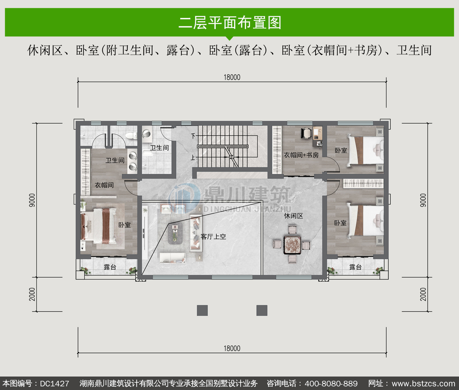 | 二 层: | 休闲区、卧室(附卫生间、露台)、卧室(露台)、卧室(衣帽间+书房)、卫生间 | |||
