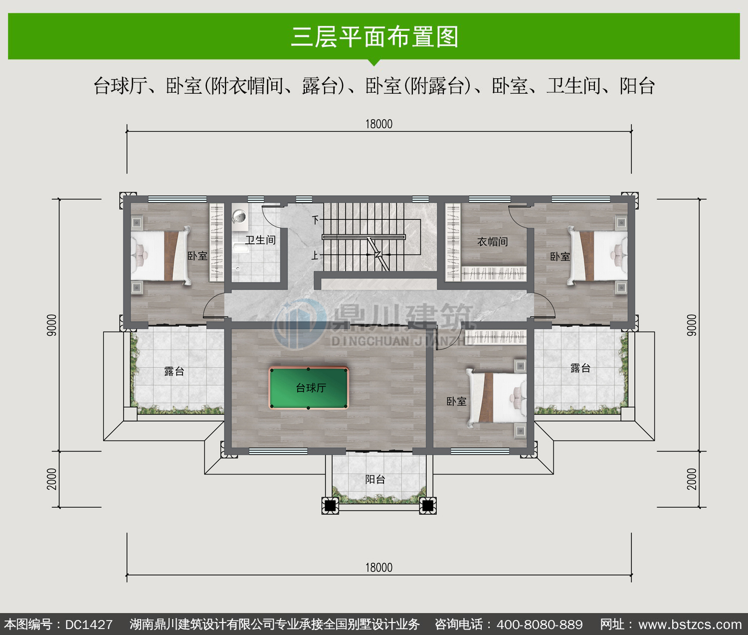 | 三 层: | 台球厅、卧室(附衣帽间、露台)、卧室(附露台)、卧室、卫生间、阳台 | |||