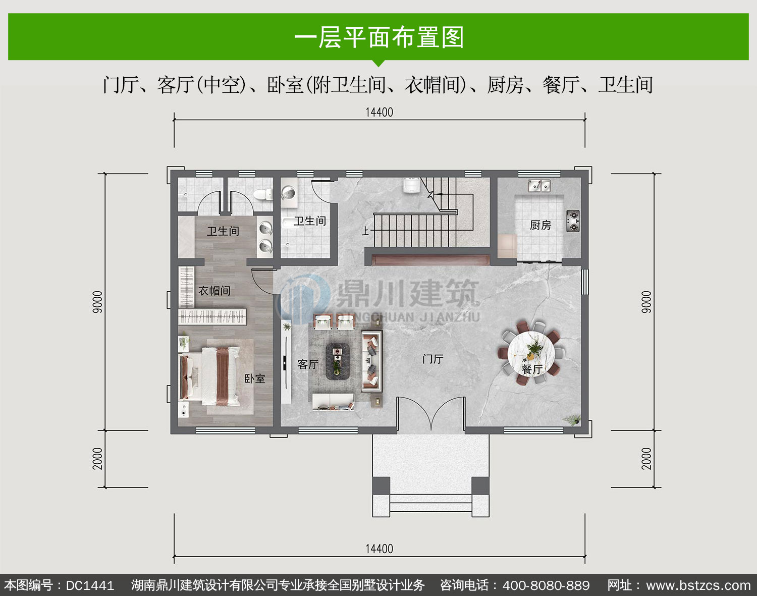 | 一 层: | 门厅、客厅(中空)、卧室(附卫生间、衣帽间)、厨房、餐厅、卫生间 | |||