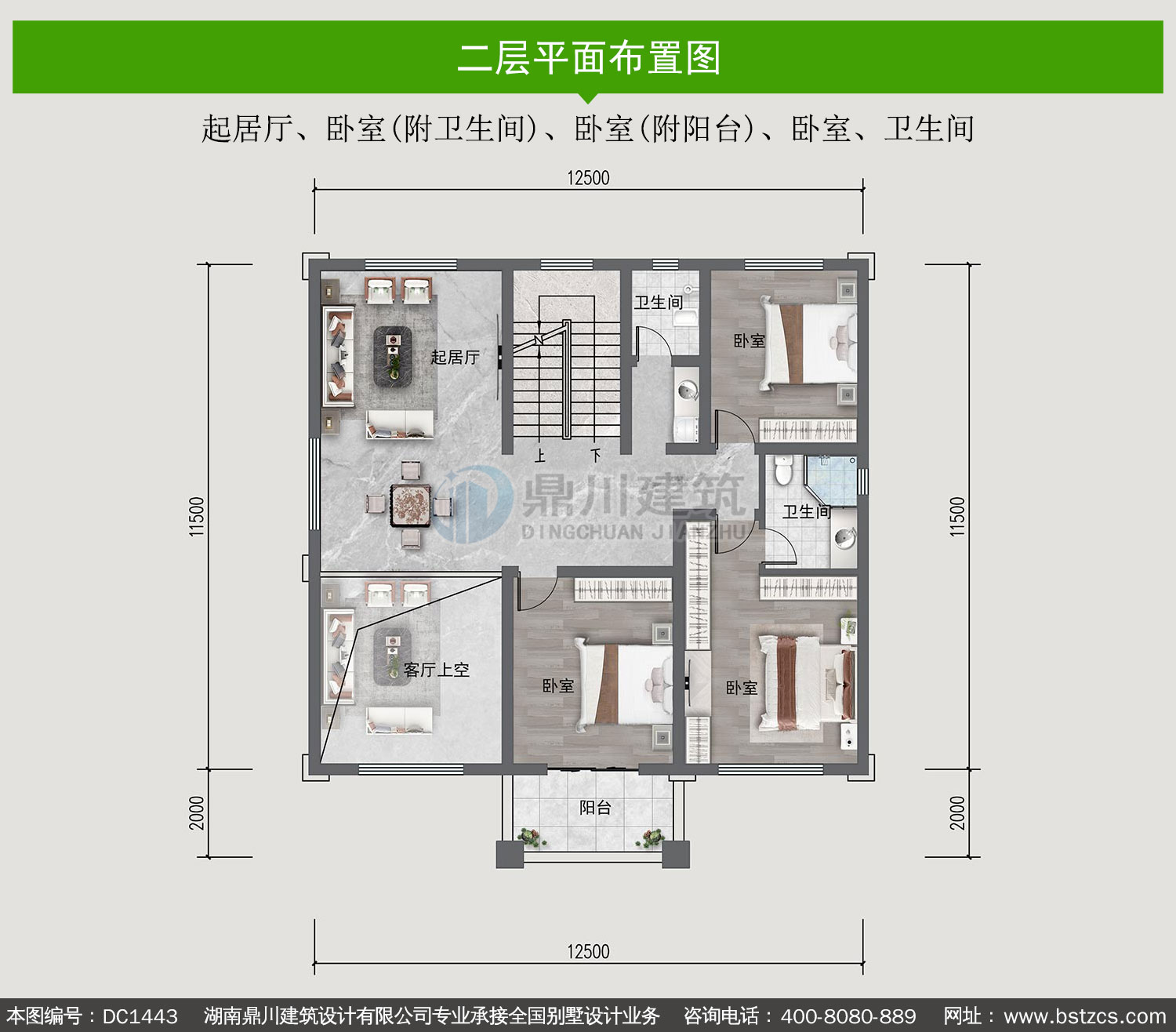| 二 层: | 起居厅、卧室(附卫生间)、卧室(附阳台)、卧室、卫生间 | |||
