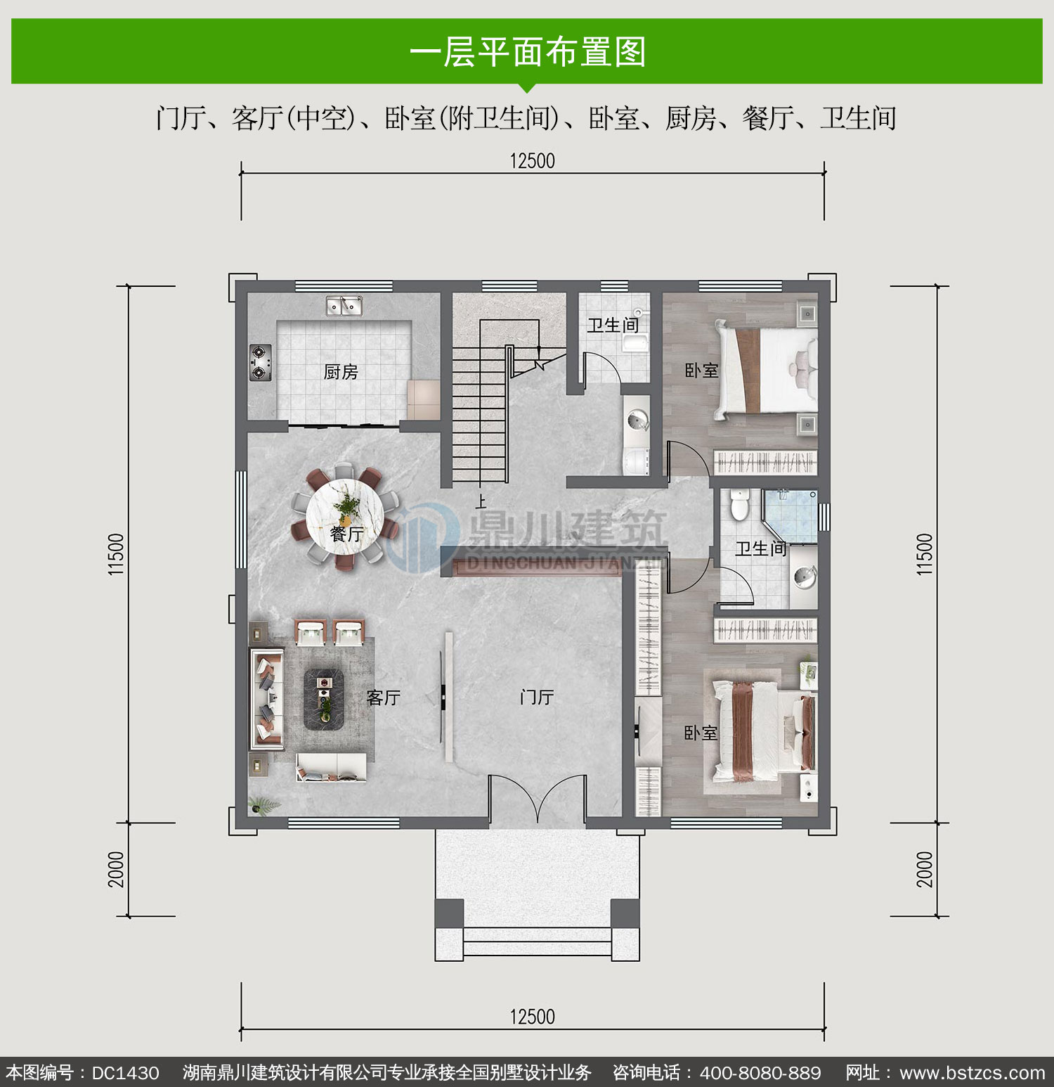 | 一 层: | 门厅、客厅(中空)、卧室(附卫生间)、卧室、厨房、餐厅、卫生间 | |||