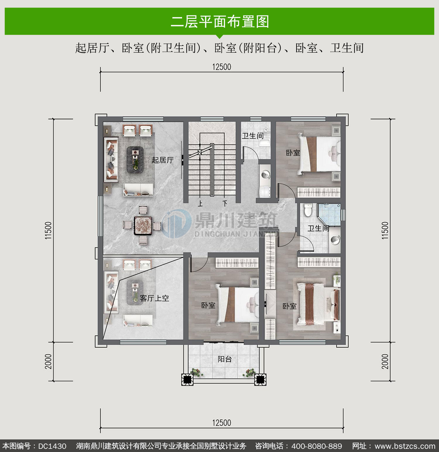| 二 层: | 起居厅、卧室(附卫生间)、卧室(附阳台)、卧室、卫生间 | |||