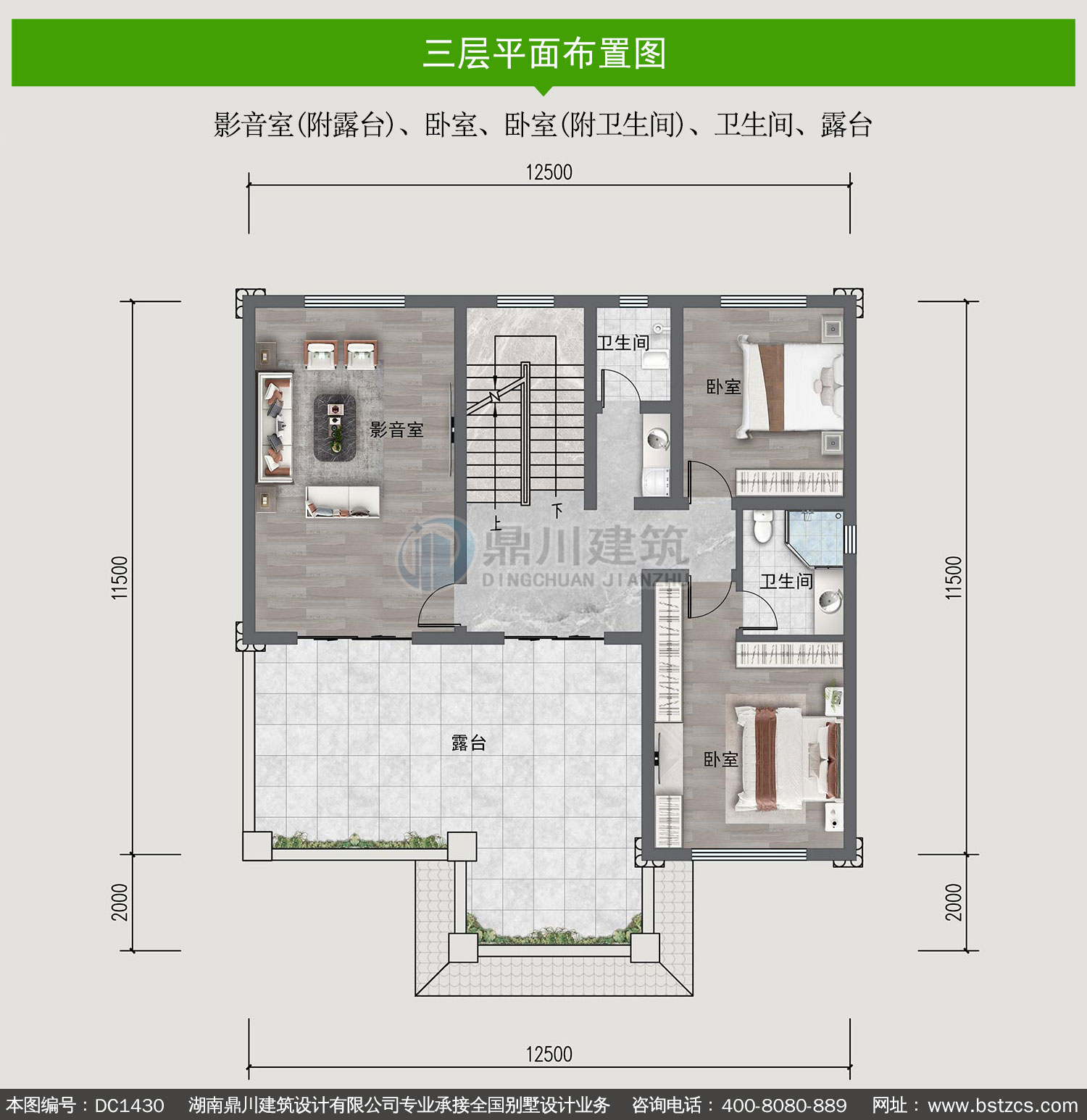 | 三 层: | 影音室(附露台)、卧室、卧室(附卫生间)、卫生间、露台 | |||